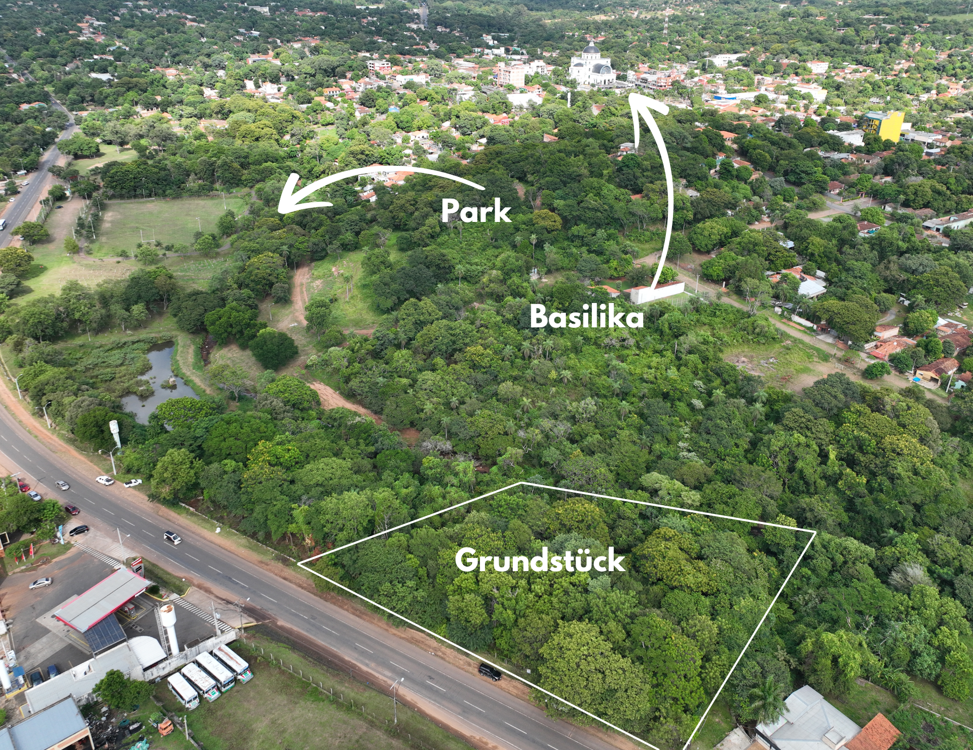 Das Projektgrundstück umfasst ca. 4500 m² und liegt im Zentrum von Caacupé. Es handelt sich vermutlich um das letzte Grundstück dieser Art und Größe in einer so begehrten Lage. Der gesamte Bereich ist mit wunderschönen, alten Bestandsbäumen bewachsen, die größtenteils erhalten und in die geplante Parkanlage rund um das Gebäude integriert werden sollen. Am hinteren Ende des Grundstücks fließt ein kleiner Bach, der zum gemütlichen Schlendern, Verweilen und Genießen des leisen Plätscherns und Vogelgezwitschers einlädt. Die Vorderseite des Grundstücks grenzt an eine Asphaltstraße, was eine perfekte Anbindung an die lokale Infrastruktur ermöglicht.